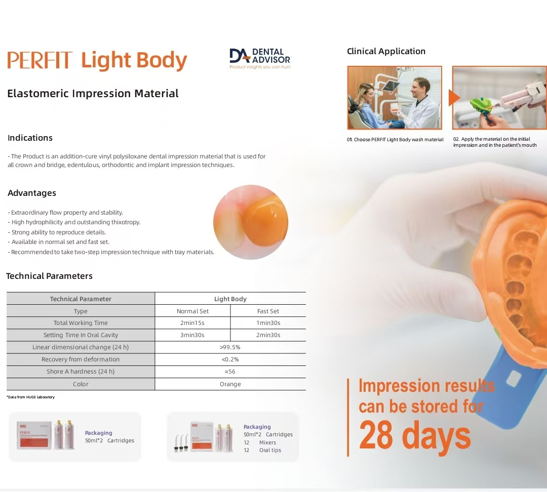 Light body impression material is a dental wash material that can be used in two-step impression techniques. It has great fluidity and can enter the gingival crevice easily. It is highly accurate and offers excellent detail.