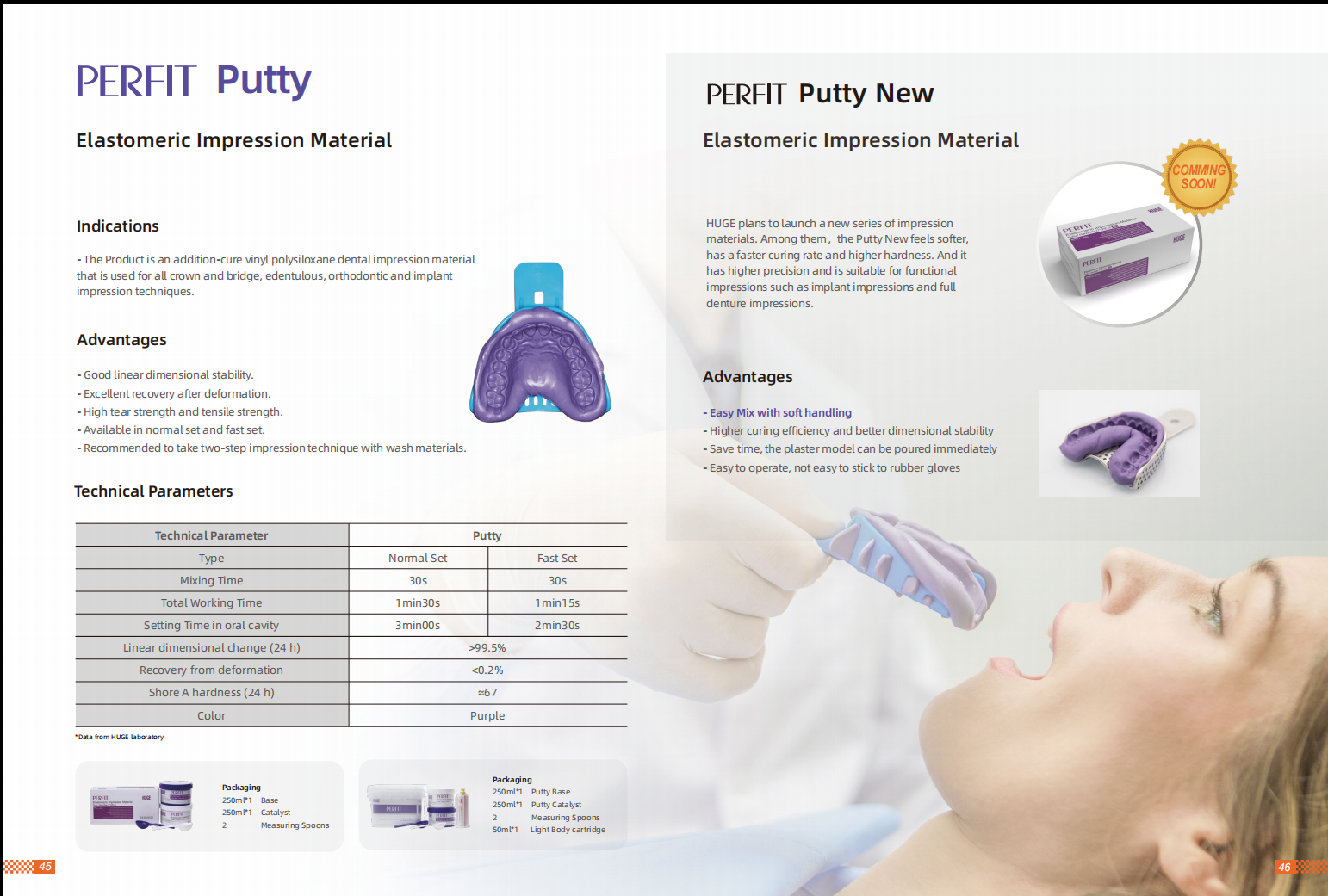 PERFITÂ impression material is a VPS impression material used to obtain precise and reliable impressions. This type of dental impression materials has excellent performance with long-term dimensional stability and high tear resistance. HUGE Dental is a leading artificial teeth manufacturer who provides a variety of clinical solutions, such as implant impressions, orthodontic impressions, auxiliary impression solutions, etc. PERFIT impression materials can meet the individual needs of dentists.